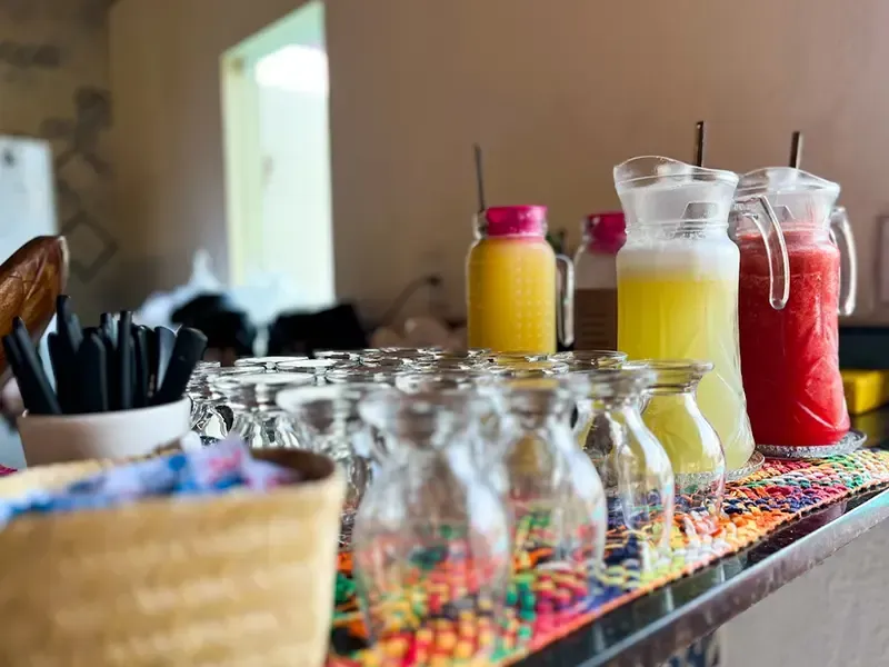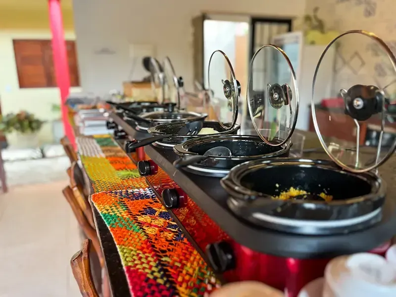 Desfrute de um café da manhã tipicamente regional na Pousada Villa Marceneiro Beach, com uma seleção variada de sucos, frutas tropicais, tapioca e cuscuz recheados, deliciosos bolos caseiros e outras opções.